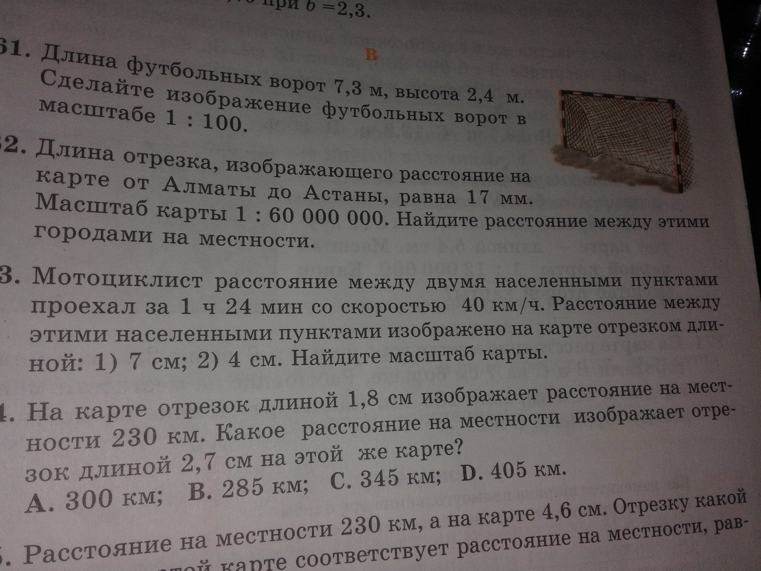 Мотоциклист расстояние между двумя намелёнными пунктами проехал за 1 час 24 минуты со скоростью 40 км/ч.Расстояние между этими населёнными пунктами изображено на карте отрезком длиной 1)7 см 2)4 см.Найдите масштаб карты.