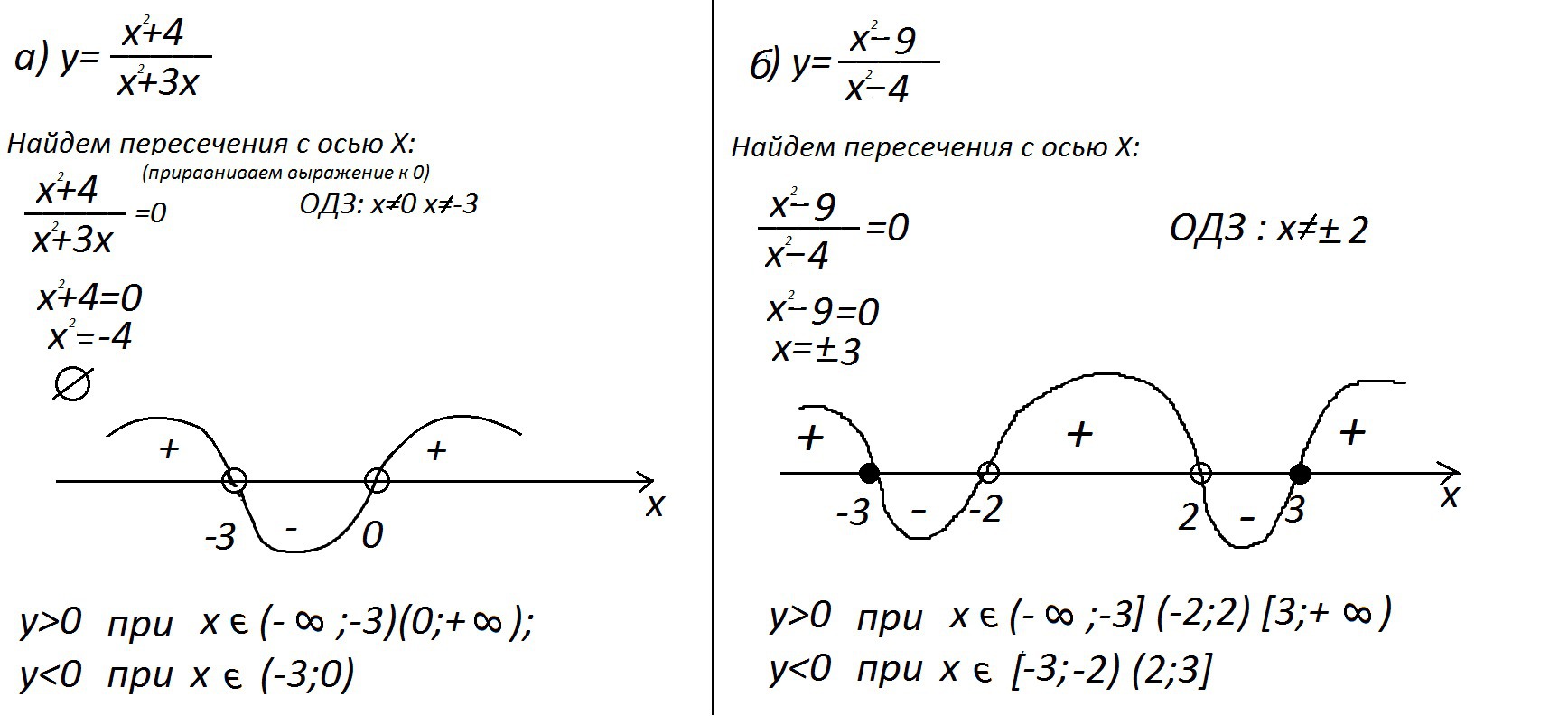 затем берешь число из каждого промежуткаи подставляешь в саму функцию. если полученное число получилось положительным, то ставишь "+", если отрицательное,то "-", а потом просто записываешь все это в ответ