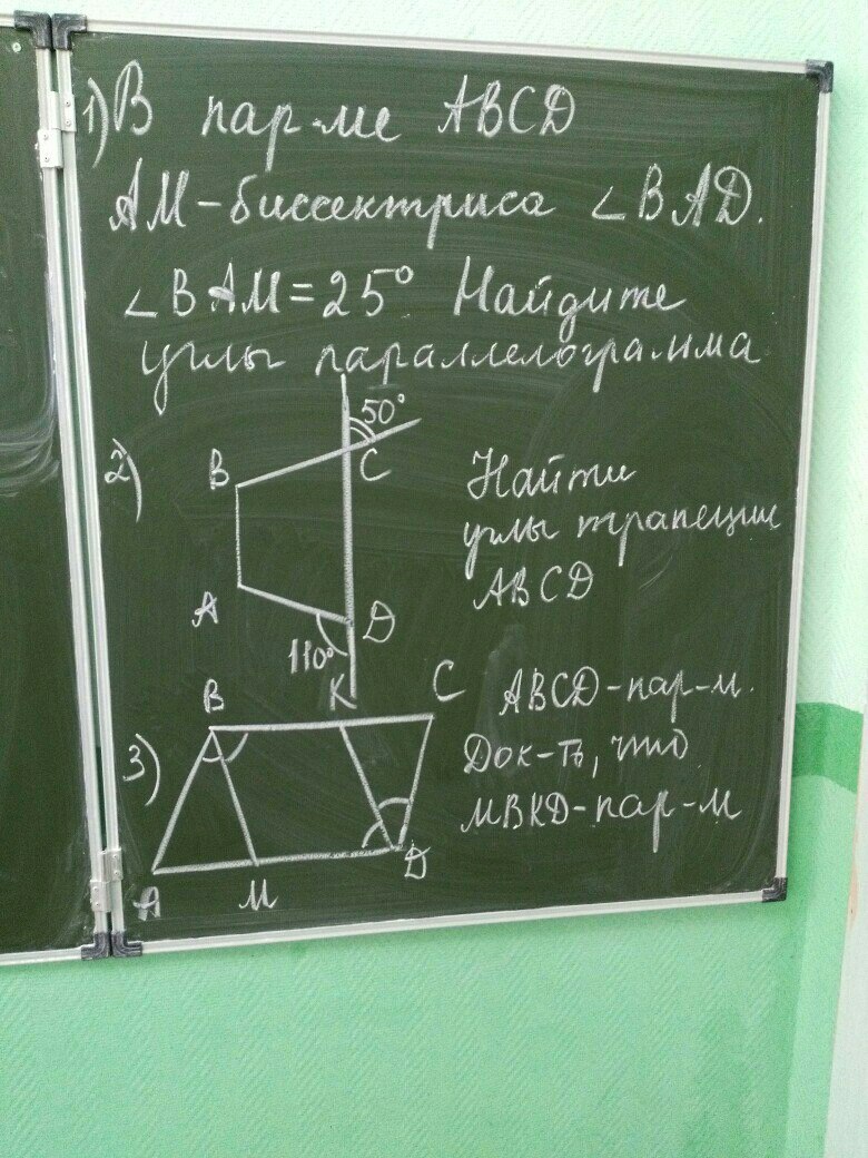 Углы ищем по смежных углам, угол 50 градусах будет равен угол ВСД, а 110 угол АДС, из этого следует, что угол А и В равен 110 градусов, а С и Д 50