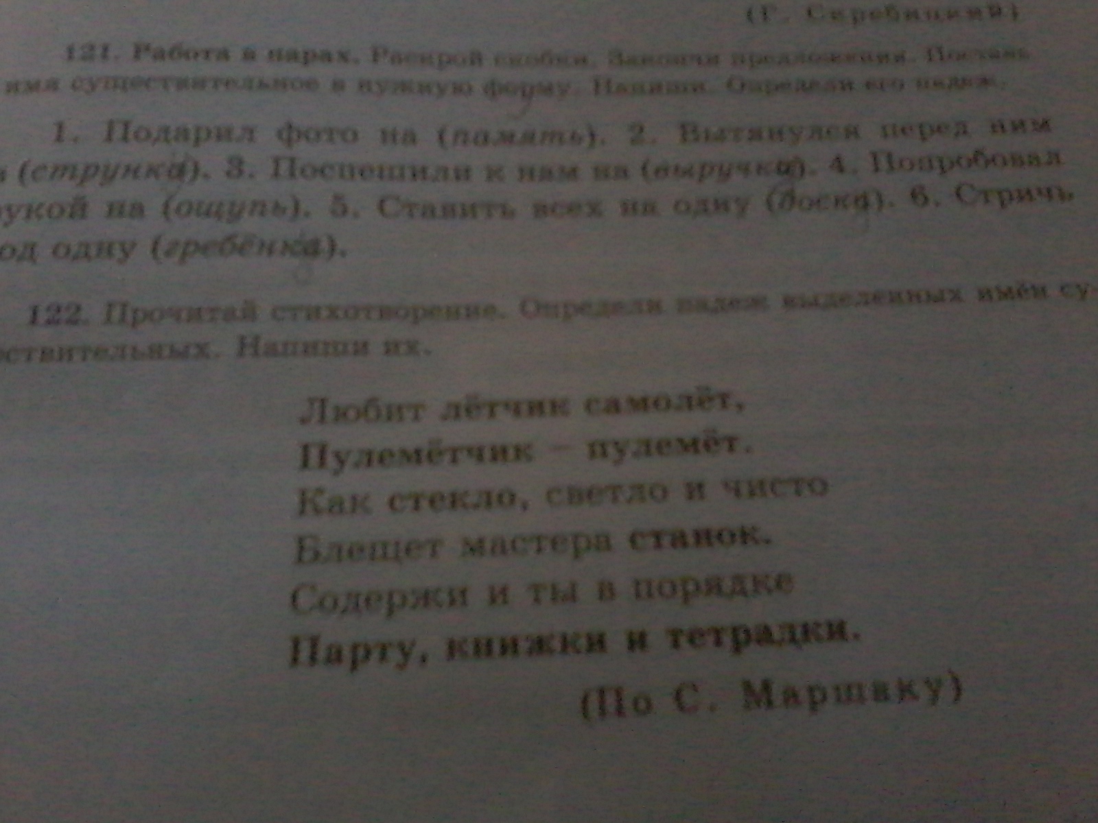 лётчик,самолёт,пулемётчик ,пулемёт,станок -(Им.п), парту(В.п), книжки(Р.п),тетрадки (Р.п)