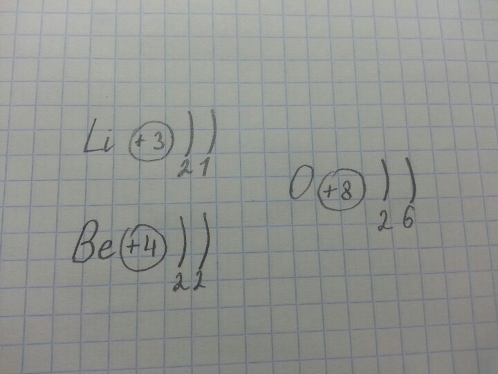 1 задание. Со ставьте схемы строения атомов лития , бериллия , кислорода. Укажите валентность , степень окисления.