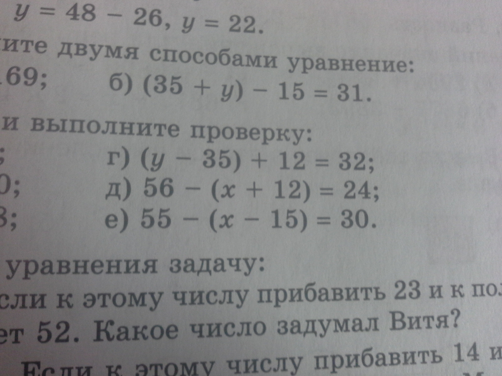 г) (у-35)+12 = 32 д) 56-(х+12)= 24 е)55-(х-15)=30
