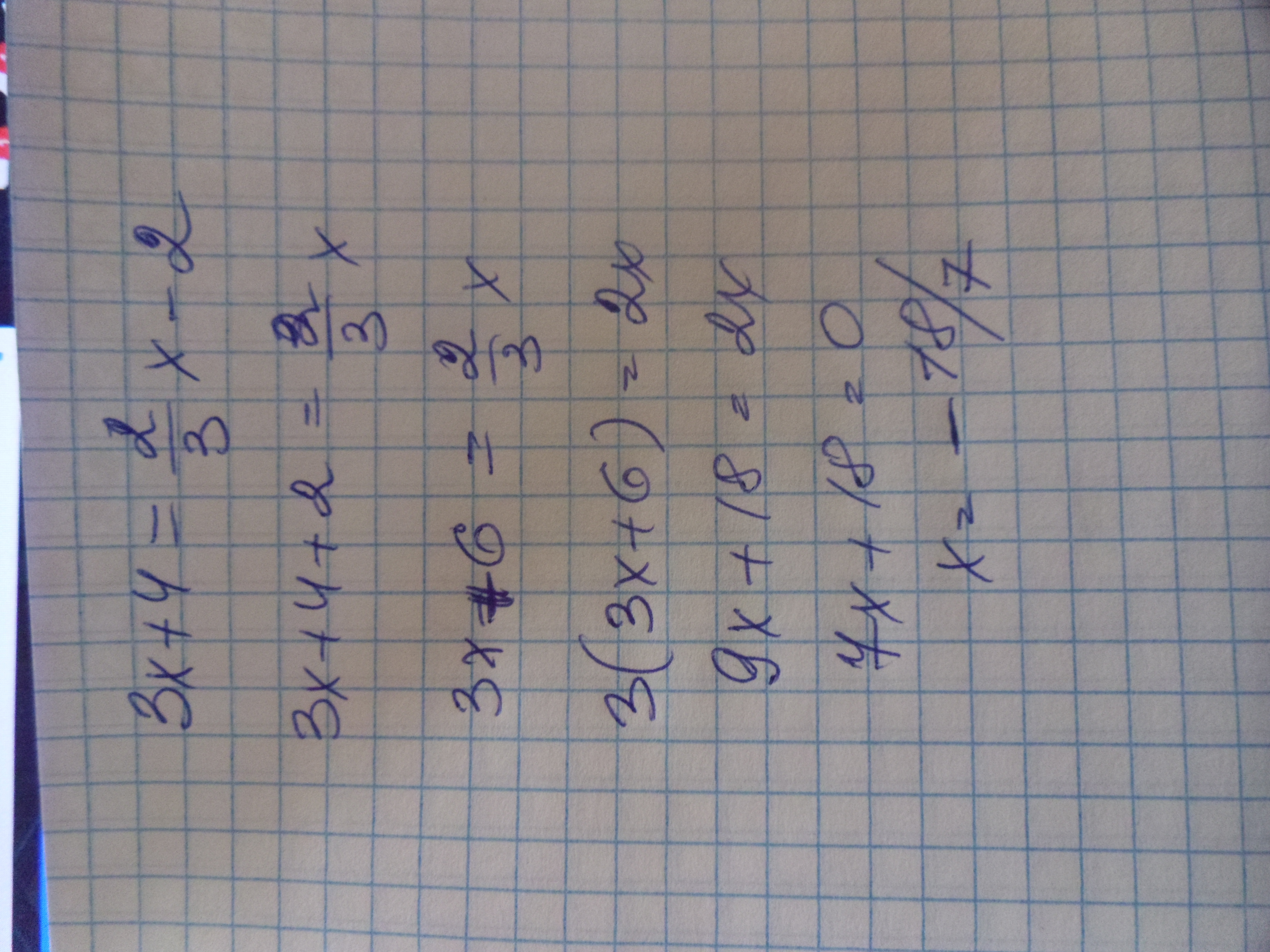 РЕШИТЕ УРАВНЕНИЕ ПОЖАЛУЙСТА 3Х+4=2/3Х-2 И ПРИМЕР (4.15+3.64-4.38-0.41) : (ПОДЕЛИТЬ) (1/3-1/4) ДРОБНАЯ ЧЕРТА 2 Х 9 Х 0.5