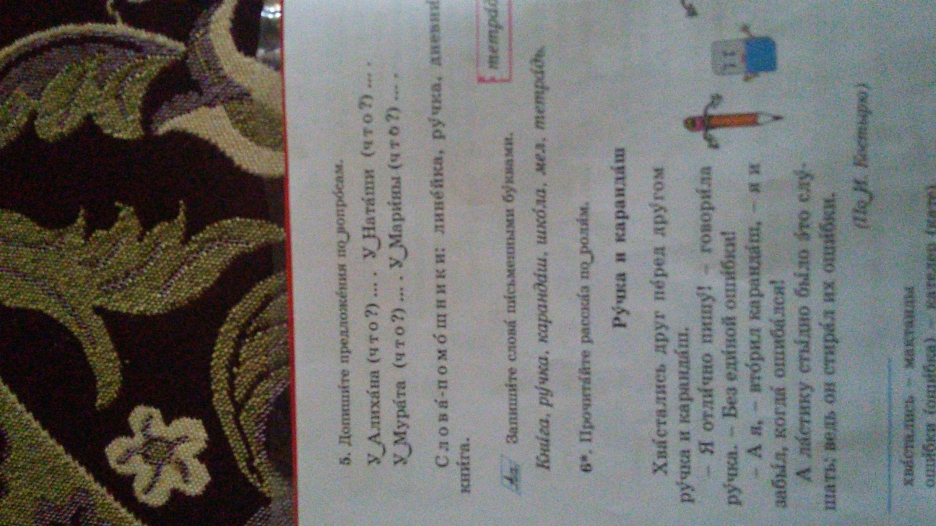 У Алихана линейка у Наташи ручка у Мурата дневник у марины книга