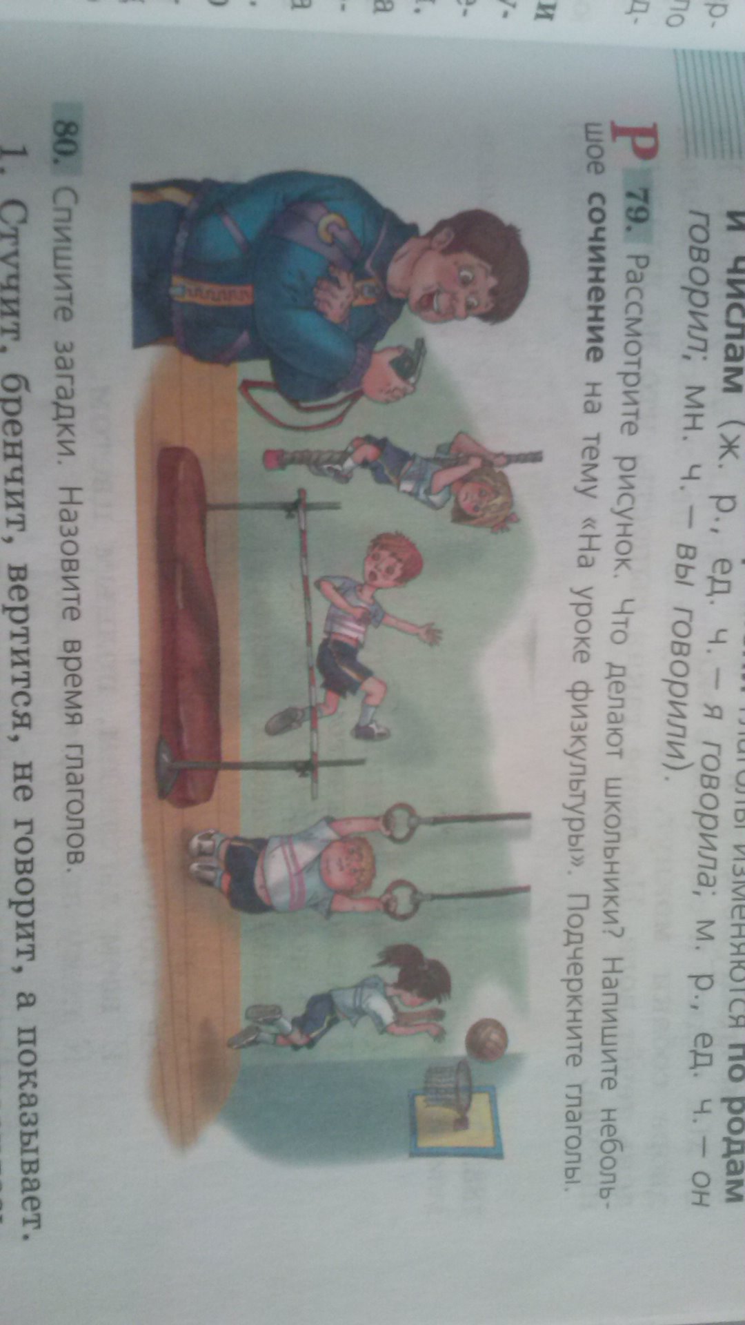Марина лазает по канату,а Влад висит на кольцах. Яна играет в баскетбол,а Саша прыгает через турник.