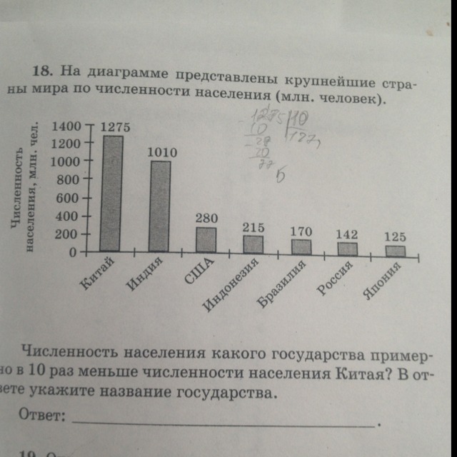 На диаграмме представлены крупнейшие страны мира по численности населения(млн чел) численность населения какого государства примерно в 10 раз меньше численности населения Китая?