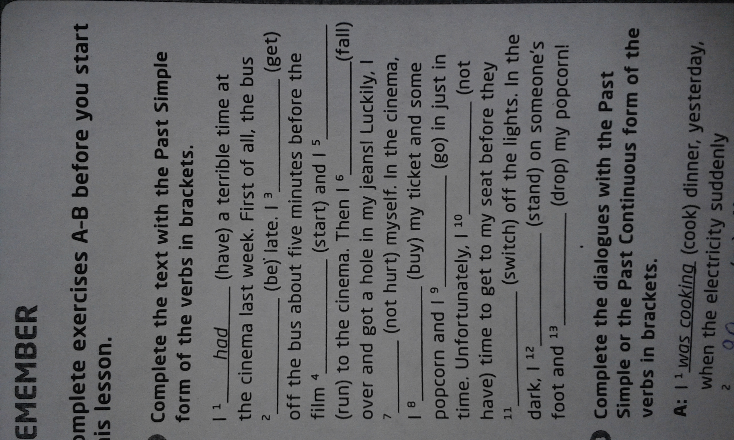 2 was; 3 got; 4 started; 5 ran; 6 fell; 7 didn`t hurt; 8 bought; 9 went; 10 didn`t have; 11 switched; 12 stood; 14 dropped