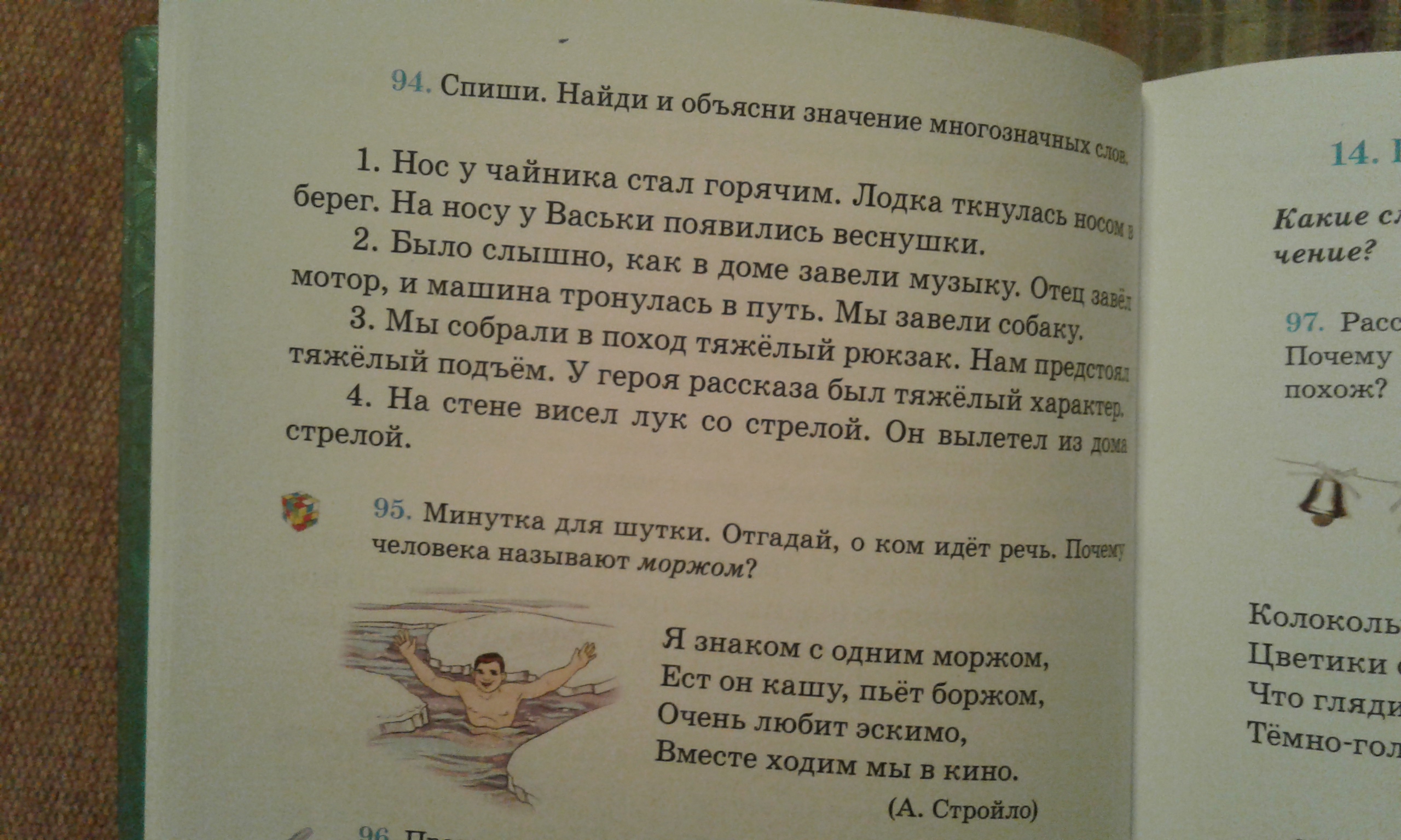 нос-нос чайника, нос лодки нос Васьки , завели - завели музыку( включили ) завели собаку (приютили) завели машину ну тут понятно тяжелый-тяжелый(сложный ) подъём- тяжёлый рюкзак- тяжелый( трудный) характер стрела- то-есть оружие и стрелой быстро мигом