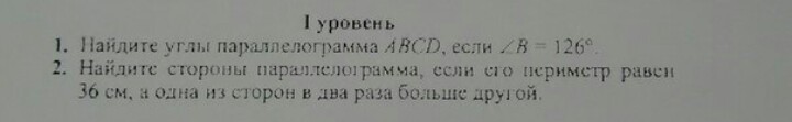 величина суммы углов, прилежащих к одной стороне параллелограмма=180 град, противоположные углы параллелограмма равны, 180-126=54, 2-ая задача-сложите все стороны, приняв одну за х, тогда другая =2х, составим уравнение (х+2х)*2=36,получим 6 и 12 см, это работа очень простая, даже неинтересно решать