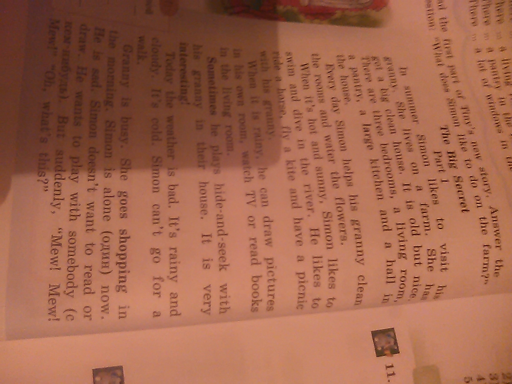 бабушка очистить дом, Саймон помогает Нравится Каждый день вода Симона комнатах и солнечные любит Когда жарко и реки. Ли он picnie плавать и нырять в должны ездить на лошади, летать змей и с его бабушкой он может нарисовать картину Когда он дождливый, или читать книги в своей комнате, смотреть телевизор в гостиной. прятки с он играет бабушку в их доме. Это очень nteresting плохо. Это дождливой и oudy. Холодно. Саймон не может пойти на