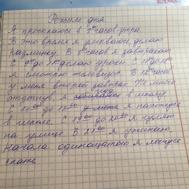 мен танғы сағат жетіде оянып тұрам.сосын кол,бетімді жуам. сегізде таңғы асымды ішем. төғыздан бастап онбіргешекеін ұй жумысын істеймін. он бірден он екігешекеін телевизор қараим . он екіде менде екінші ас. бірəз демалып ,мектепке барам.он төрттен он сегіз отызғашікеин сабəқтар отеді.кешкі сағат жетіден сегіз жарымға дейін далаға шіғам.сағат төғызда кешкі асымды ішем.кешкі он бірдың кезінде мен үйіқтаим.