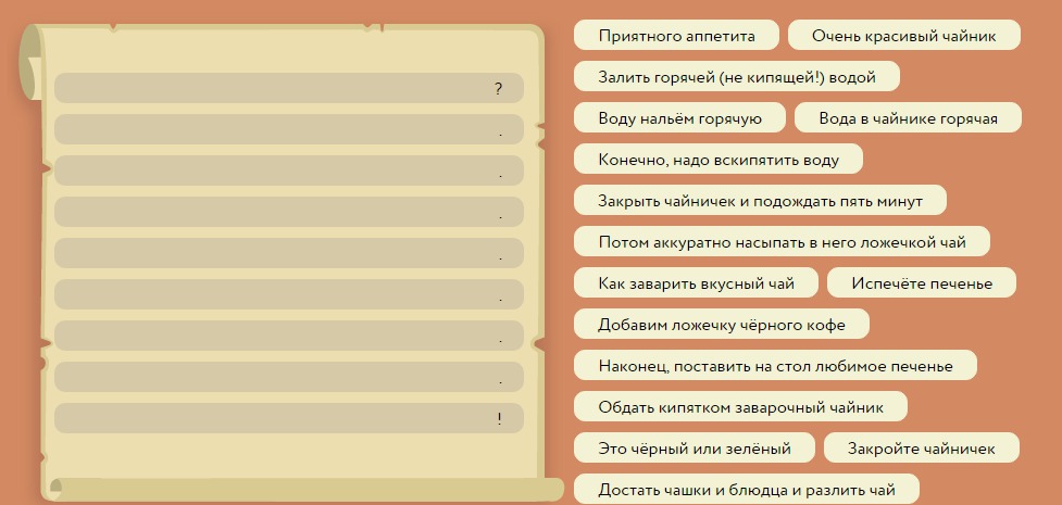 1)Как заварить вкусный чай? 2)Конечно,надо вскипятить воду. 3)Обдать кипятком заварной чайник. 4)Потом аккуратно насыпать в него ложечкой чай. 5)Залить горячей(не кипящей!)водой. 6)Закрыть чайничек и подождать пять минут.7)Достать чашки и блюдца и разлить чай.8)Наконец, поставить на стол любимое печенье.9)Приятного аппетита!