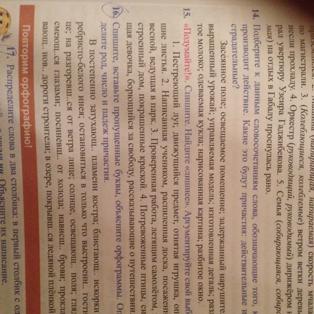 16: В постепенно затухающЕм пламени костра, блистающИе искорки ребристо-белого инея, в только что выстроЕнной гостинице, на разгоревшЕмся от ветра лице, солнце, освещающЕе поля; глядя смеющИмися глазами; посиневшИе от холода;нависшИе брови; прокладывающИе новые дороги строители; в озере, покрывшемся ледяной пленкой (все по правилам склонения причастий женского, мужского и среднего рода единст числа и причастий множ числа)