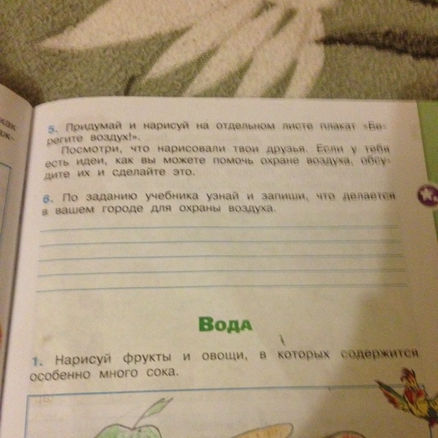Рисунок где ты сажаешь ростения и напиши помогите беречь воздух! Это номер(5) (6)сажаем деревья для того чтобы воздуха было больше