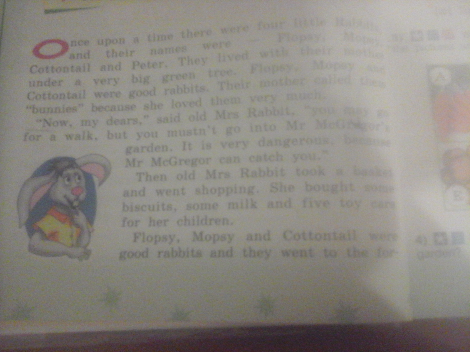 once upon a time there were four little Rabbits, and their names were - Flopsy, Mopsy,Cottontail and Peter. They lived with their mother called them "bunnies because she loved them very much. "Now, my dears," said old Mrs Rabbit, "you may go for a walk, but you mustn't go into Mr McGrogor's garden. It is very dangerous, decays Mr McGrogor can catch you. Там ещё есть я фото сделала