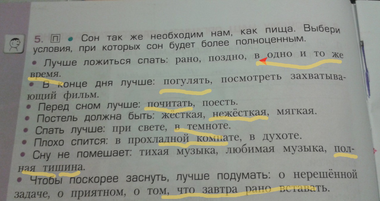 1-в одно и тоже время,2-погулять,3-почитать,4-нежесткая,5-в темноте,6-в духоте,7-полная тишина,8-о приятном.