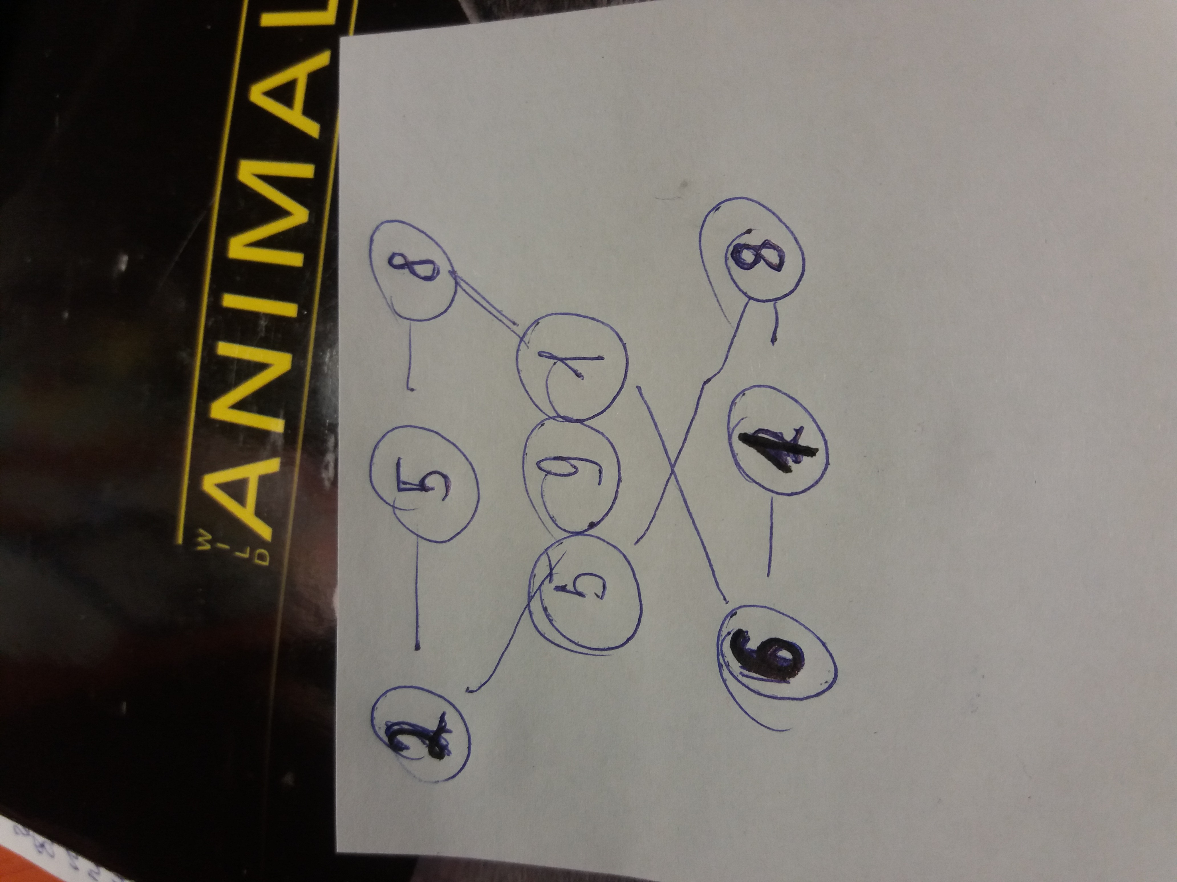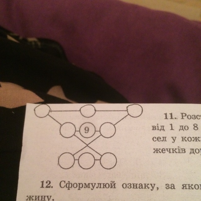 расставь в кружках числа от 1 до 8 так чтоб сумма этих чисел в каждом ряду из трёх кружочков равнялась 15