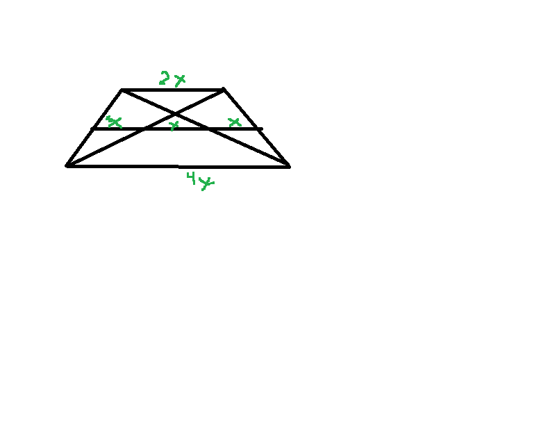 части средней линии являются средними линиями треугольника, пусть одна часть = х, тогда меньшее основание = 2х, а большее= 4х