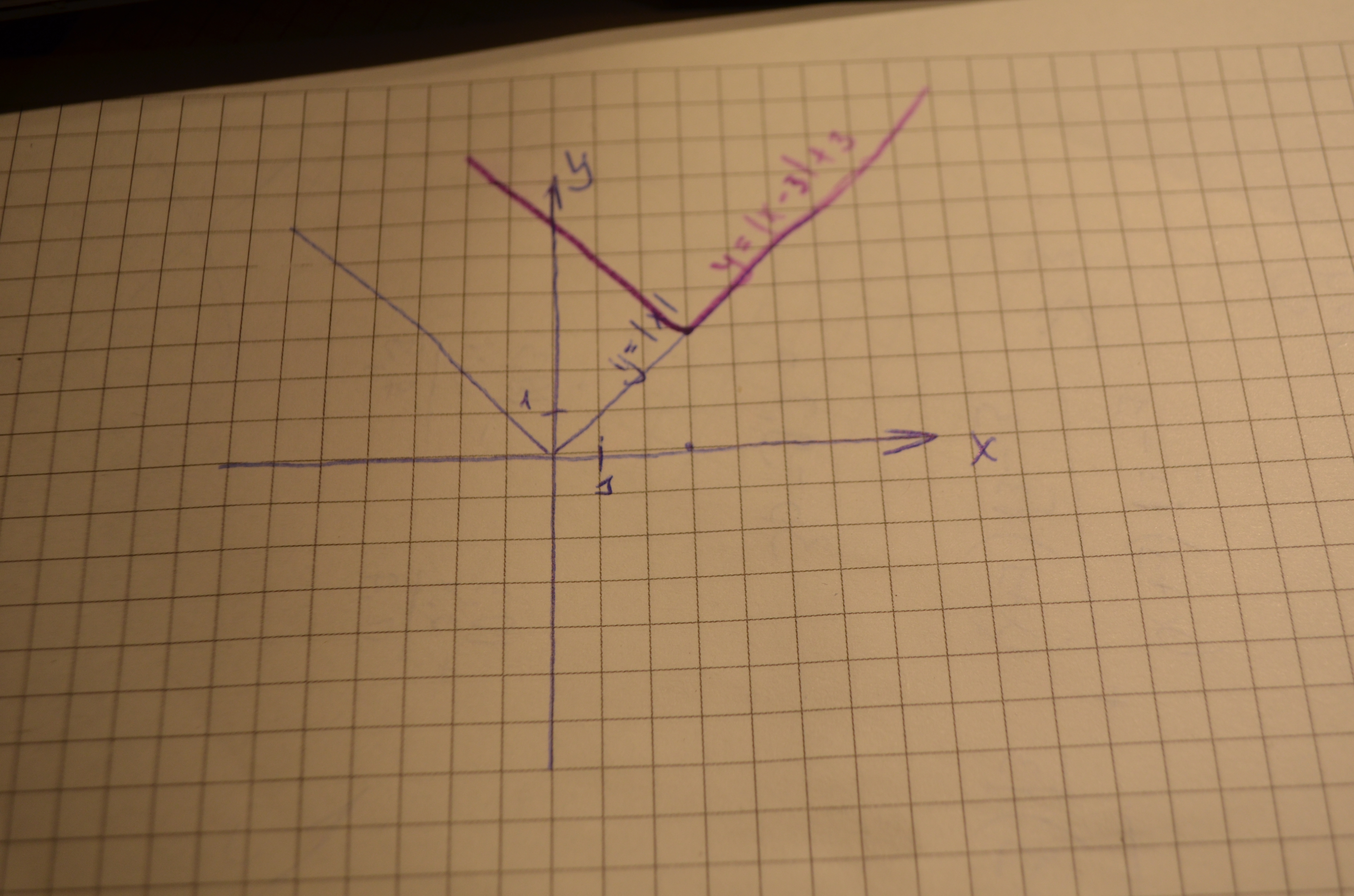 y=|x| - uрафик выглядит как галочка, ветви - биссектрисы 1 и 2 четвертей, вершина в точке (0;0). Дальше смещением на 3 клетки в положительную сторону по Ох (вправо) и на 3 клетки в положительную сторону Оу (вверх)