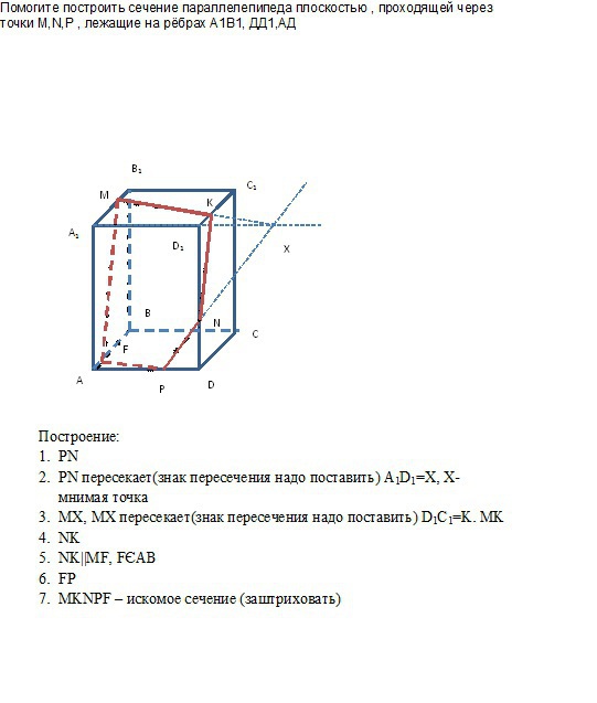 Помогите построить сечение параллелепипеда плоскостью , проходящей через точки М,N,P , лежащие на рёбрах А1В1, ДД1,АД