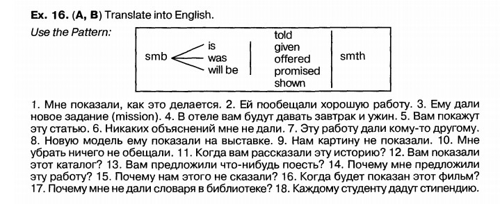 1. I was shown how to do it/ 2. She was promised a good job. 3. He was given a new mission. 4. You will be given breakfast and supper at the hotel/Breakfast and supper will be given to you at the hotel. 5. A new artcile will be shown to you. 6. No explanations were given to me. 7. This work was given to smb else. 8. The new model was shown to him at the exhibition. 9. The painting wasn`t shown to us. 10.I wasn`t promised to remove anything. 11.When the story was told to you? 12.When were you shown the catalog? 13.Were you offered something to eat? 14.Why was I offered this job? 15.Why weren`t we told anything? 16.When will this film be shown? 17.Why wasn`t I given the dictionary in the library? 18.Each student will be given a scholarship.
