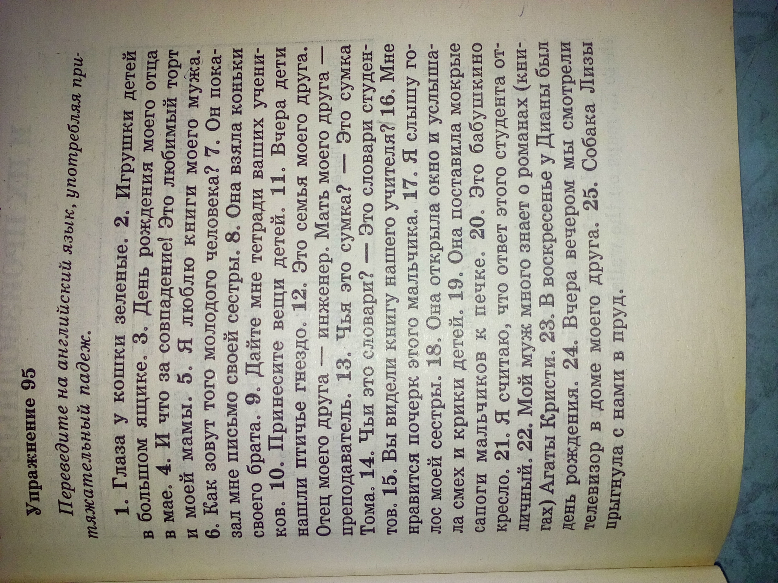 Exercise 95 pevedume into English unotreblyaya npa myaJveatelny Adeje. 1. The green eyes of a cat. 2. toy etc. in a large box. 3. The day of my father's birthday in May. 4. and what a coincidence! This favorite cake and my mother. 5. I love my husband's books. 6. What is the name of the young man? 7. It is Hall of me a letter to his sister. 8. She took her brother's horses. 9. Give me your notebook disciples. 10. Bring the kids stuff. 11. Yesterday, the children found a bird's nest. 12. This is the family of my friend. My friend's father is an engineer. My friend's mother a teacher. 13. It is with atoms whose Tom. 14. Whose dictionaries? These are students' dictionaries. 15. Have you seen the book of our master 16. I like this boy's handwriting. 17. I hear of Los my sister. 18. She opened the window and He heard but laughter and cries of children. 19. She put wet boots boys to the stove. 20. This grandmother chair. 21. I believe that the response of the student relative personal, 22. My husband knows a lot about the novels (CED so) by Agatha Christie. 23. On Sunday yDiany had a birthday. 24. Last night we watched TV in my friend's house. 25. Lisa dog jumped into the pond with us хотя что-то скину