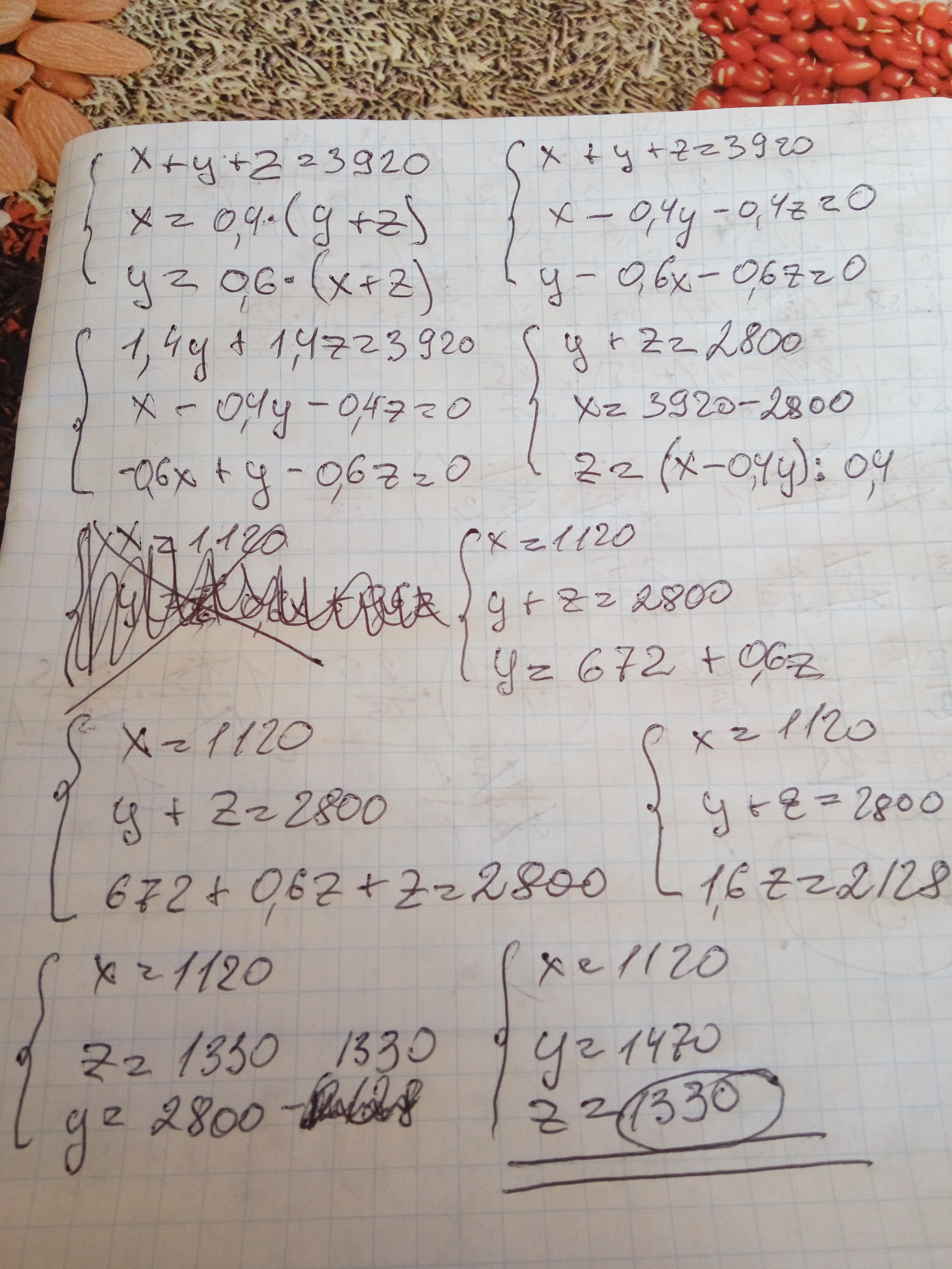 поезд за трое суток прошел 3920 км за 1 40% пути пройденного за 2 и 3 сутки,а за 2 сутки 60%пути за 1 и 3.Какое растояние он прошол за 3 сутки?