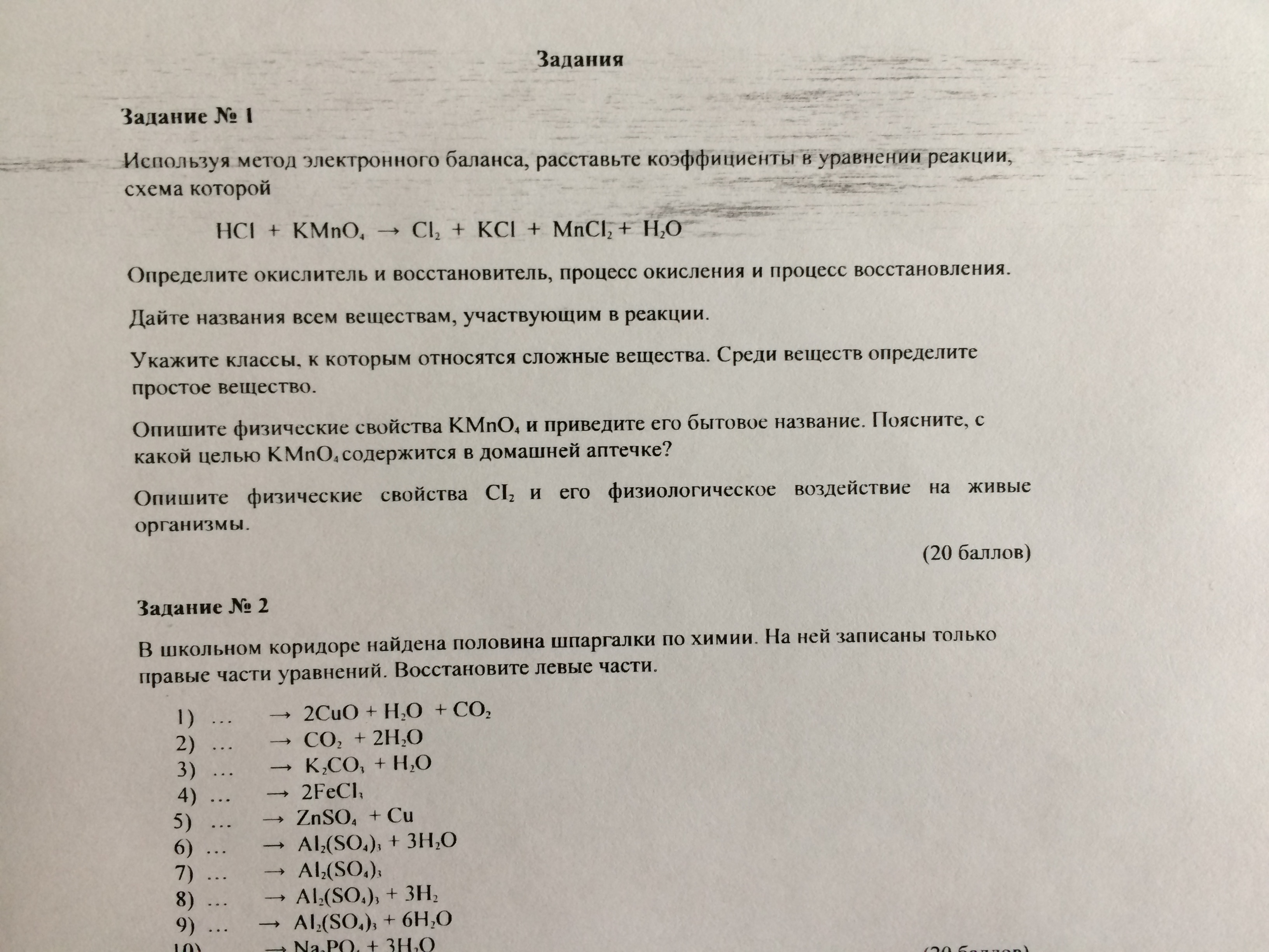 16HCl + 2KMnO4 = 5Cl2 + 2KCl + 2MnCl2 + 8H2O