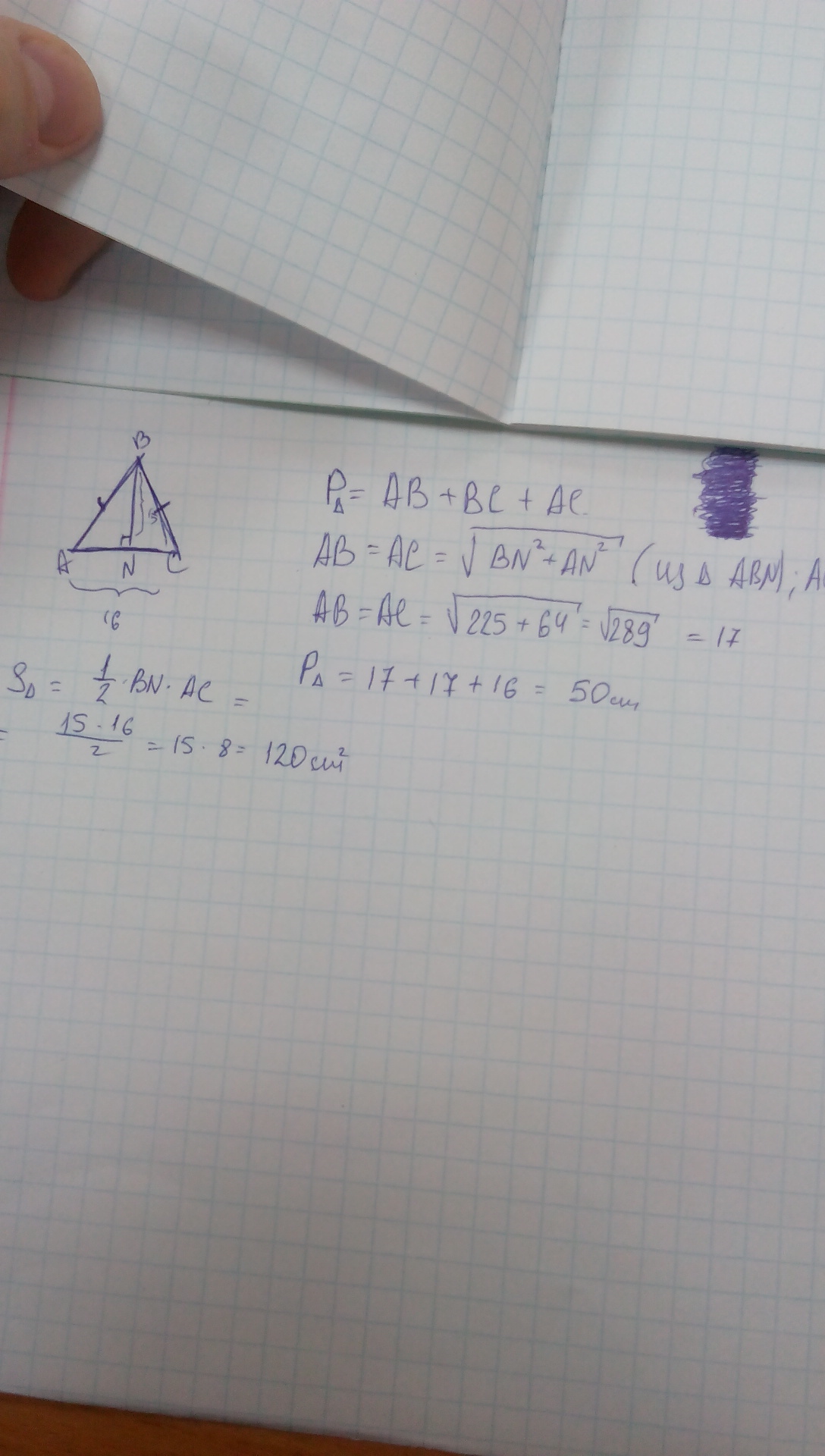В равнобедренном треугольнике AB=BC,BN высота.Найти периметр и площадь треугольника ABC,если AC=16см. и BN=15см