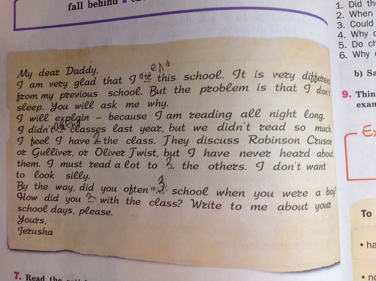 I will explain - because I am reading all night long. I didn't attend classes last year, but we didn't read so much. I feel I have ... the class. They discuss Robinson Crusoe or Gulliver, or Oliver Twist, but I have never heard about them. I must read a lot to... the others. I don't want to look silly.