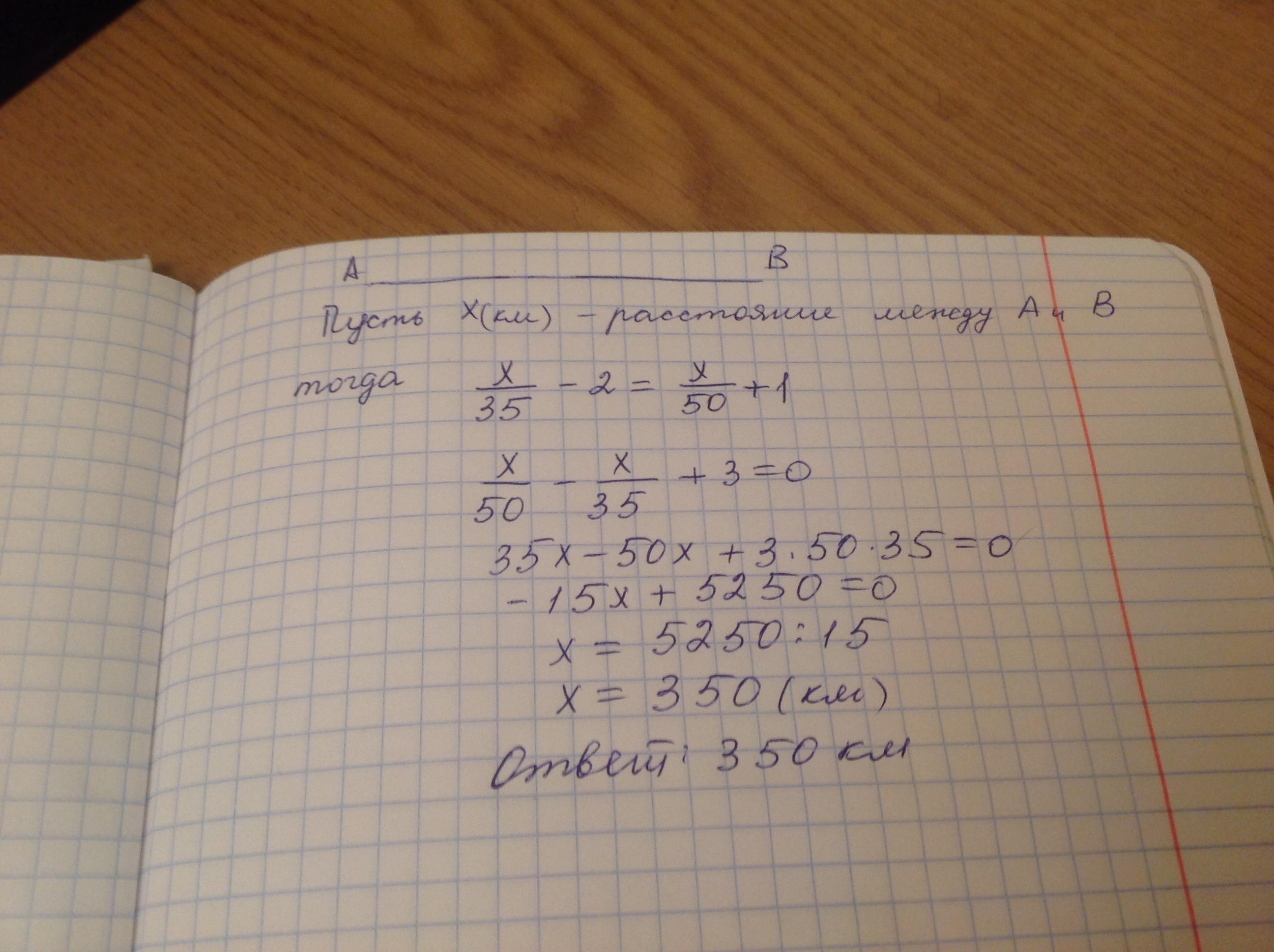 Мотоциклист выехал из города А в город В. Если он будет ехать со скоростью 35 км/ч, то опоздает на 2 ч. Если его скорость будет 50 км/ч, то он приедет на один час раньше срока. Найдите расстояние между городами А и В?