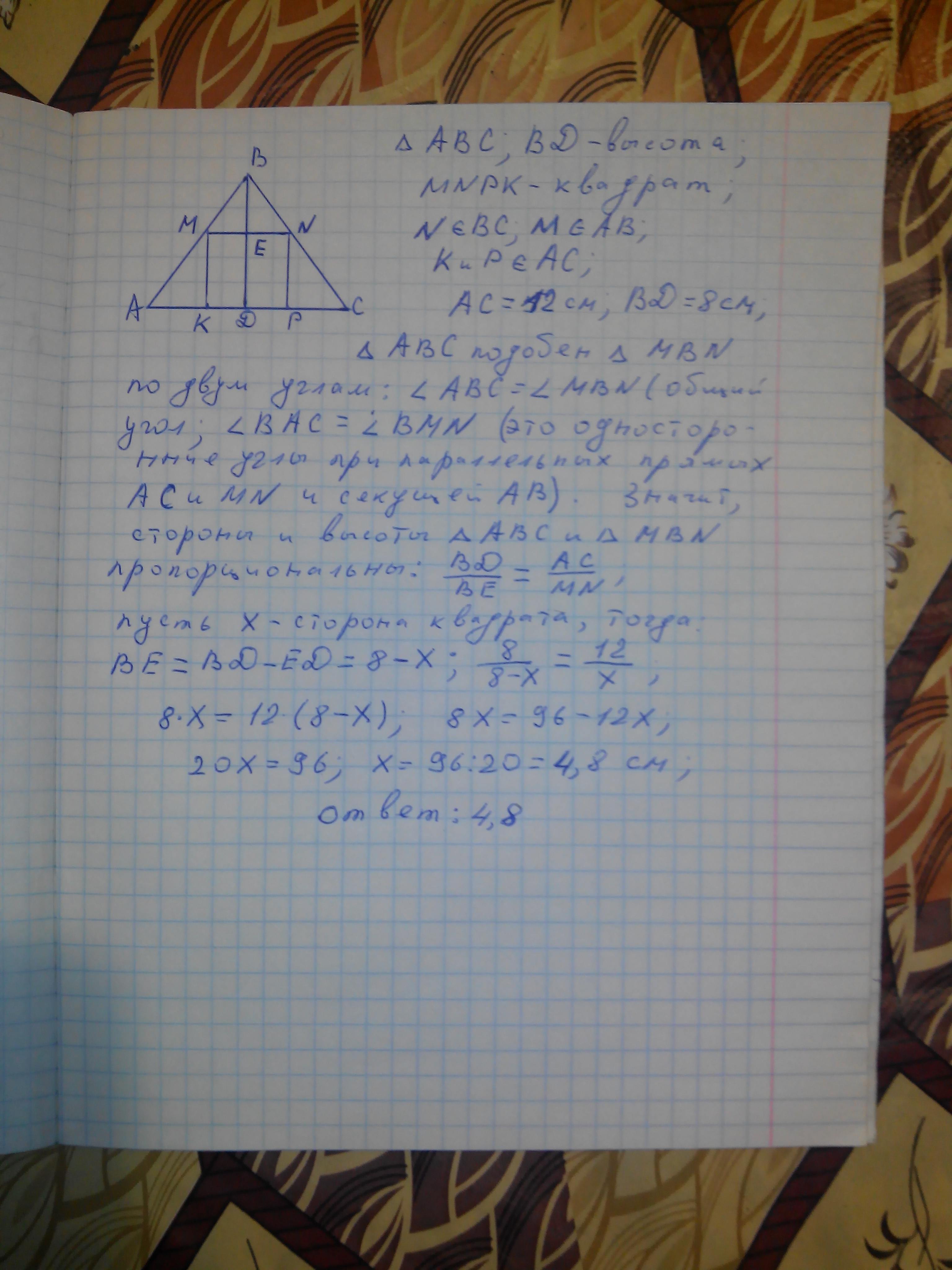 ПОМОГИТЕ! В равнобедренный треугольник с основанием 12см и высотой 8см вписан квадрат так, что две его вершины лежат на основании треугольника, а две оставшиеся- на