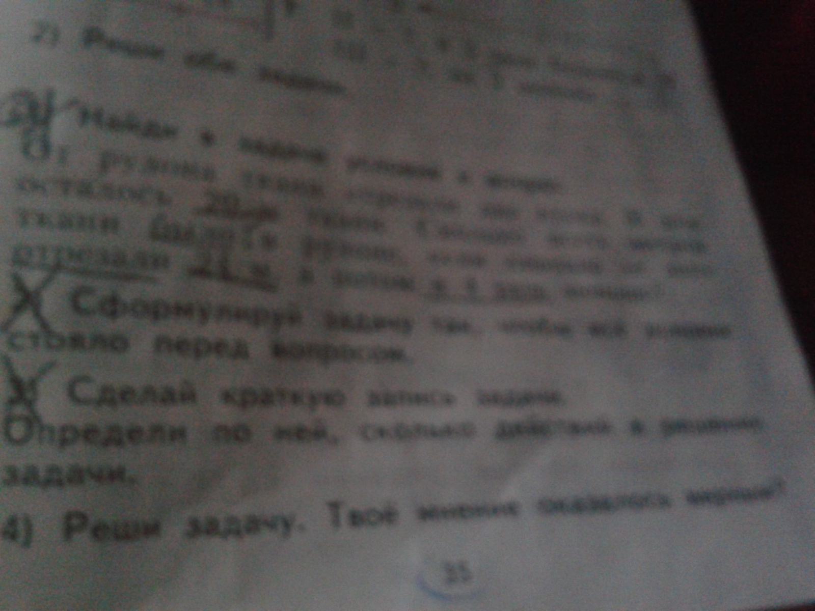 Найди в задаче условие и вопрос от рулона ткани отрезали Два куска в нем осталось 20 метров ткани Сколько всего метров ткани было в рулоне если сначала от него отрезали 24 метров а потом в 4 раза меньше Сформулируй задачу так чтобы все все условия стояла перед вопросом сделай краткую запись задачи Определи по несколько действий в решении задачи и реши задачу твое мнение оказалось верным