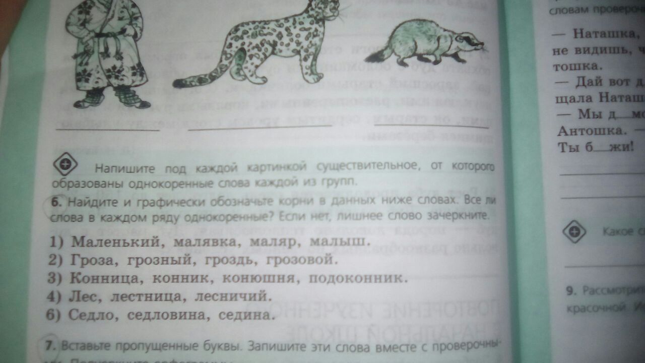 1) лишнее слово: маляр, корни слов -мал-. 2) лишнее слово: гроздь, корни слов гроз. 3) лишнее слово: подоконник, корни слов кон. 4) лишнее слово: лестница, корни -лес- 6) лишнее слово: седина, корни -седл-