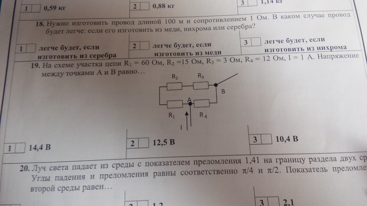 На схеме участка цепи r1=60 Ом, r2=15 Ом, r3=3 Ом, r4=12 Ом, I=1 А. Напряжение между точками A и B равно...