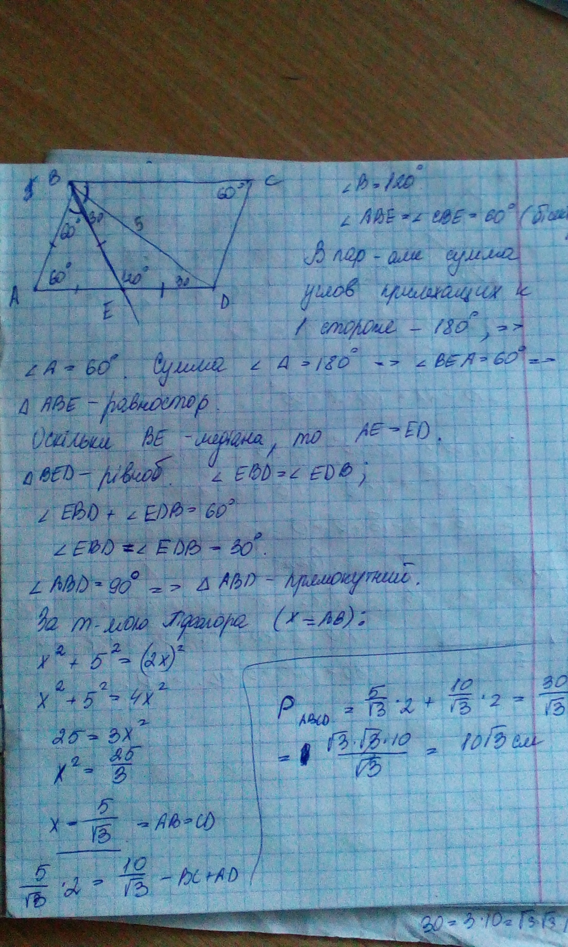 ДАМ много БАЛЛОВв параллелограмме абсд угол б равен 120 из угла б была проведена биссектриса ве которая делила ад на две равные части вд = 5 см найдите периметр параллелограмма
