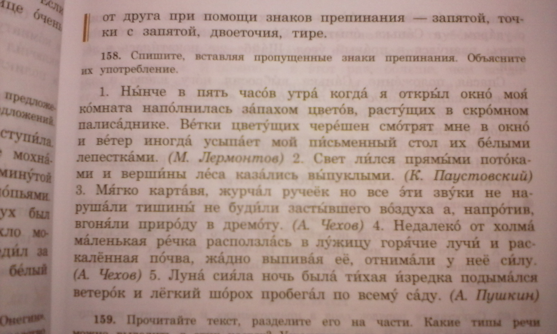 1.Нынче в пять часов утра, когда я открыл окно, моя комната наполнилась запахом цветов, растущих в скромном палисаднике.(1-е 2 - сложн.предл,3-я прич.оборот) Ветки цветущих черешен смотрят мне в окна, и ветер иногда усыпает мой письменный стол их белыми лепестками.(сложн.предл)2.Свет лился прямыми потоками и вершины леса казались выпуклыми.3.Мягко картавя,(дееприч оборот) журчал ручеек,(сложн пр) но все эти звуки не нарушали тишины,(однородные сказ) не будили застывшего воздуха,(однородн сказ) а, напротив(вводное слово), вгоняли природу в дремоту.4.Недалеко от холма маленькая речка расползалась в лужицу,(сложн предл) горячие лучи и раскалённая почва, жадно выпивая её(дееприч оборот), отнимали у неё силу; 5.Луна сияла,(сложн пр) ночь была тихаСложн пр), изредка подымался ветерок,(сложн пр) и легкий шорох пробегал по всему саду.