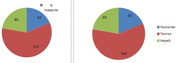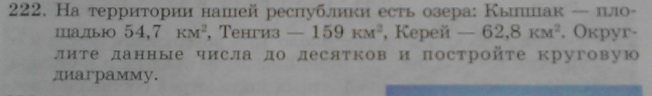 На территории нашей республики есть озера: Кыпшак - площадью 54,7 кв км, Тенгиз - 159 кв км, Керей - 62,8 кв км. Округлите данные числа до десятков и постройте круговую диаграмму.