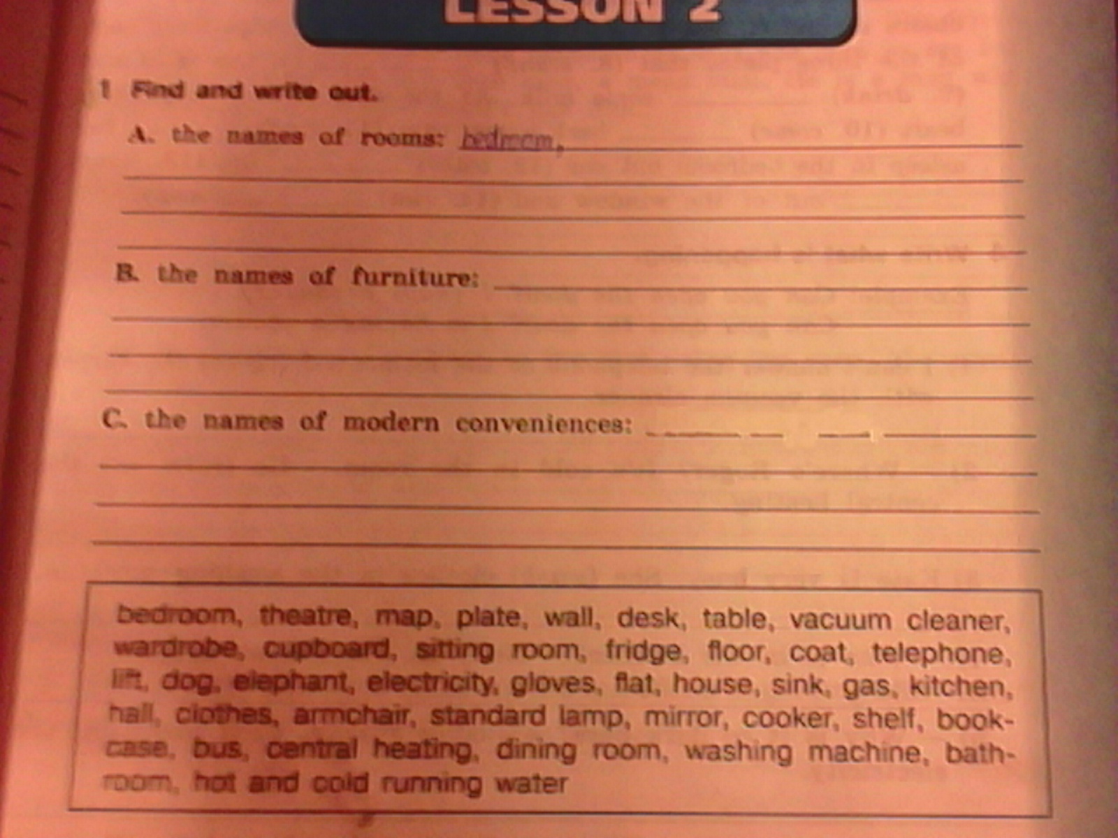 B- desk, table, vacum cleaner, wardrope, fridge, telephone,