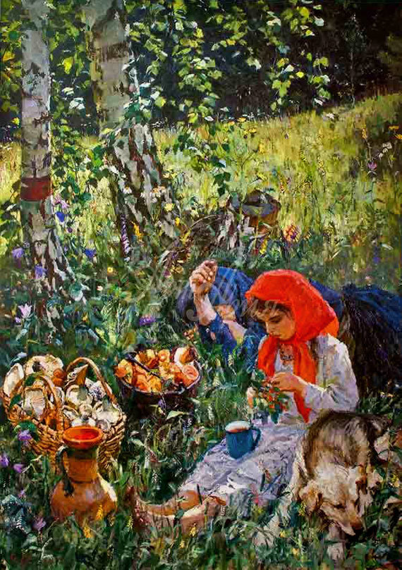 Аркадий Александрович Пластов – великий художник. У него много замечательных картин, а одна из них: “Летом``. На картине художник изобразил жаркий летний день. Двое грибников: похоже мама и дочка – отдыхают в тени под березами.Рядом с девочкой лежит собака. Она тоже отдыхает, как и ее хозяева. День слишком жаркий. Собака устало опустила голову на лапы.Я внимательно вглядываюсь в лицо девочки. Оно загорелое, на смуглых щеках играет румянец. Глаза девочки опущены. Из-под косыночки выбиваются темные волосы, падая на грудь.На втором плане изображена уставшая женщина в синем платье и синем платке. Женщина дремлет. Одну руку она подложила под голову, а другой прикрыла от солнца лицо.также на траве стоит корзина и ведро, наполненные грибами. Рядом – кувшин со спелыми ягодами, хочется положить их себе в рот и ощутить кисловатый вкус лесной ягоды. Грибники расположились под березой на красивой полянке. Среди изумрудной травы виднеются какие-то желтые цветочки. Яркие лучи солнца падают на листочки, и они кажутся золотистыми Создается такое впечатление, что я нахожусь на этой прекрасной поляне, где расположились уставшие грибники