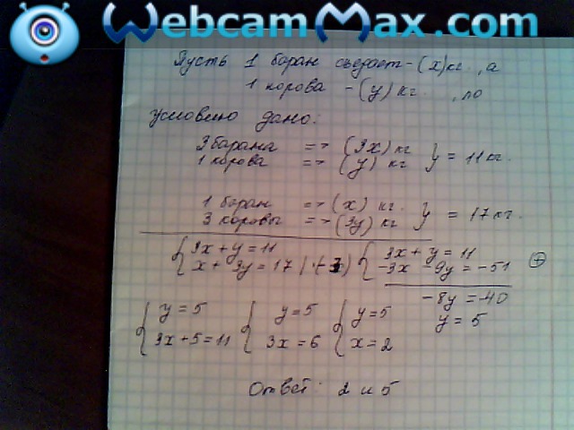 три барана и корова за день съедает 11 килограмм комбикорма, а один баран и три коровы 17 килограмм. сколько килограммов комбикорма съедает один баран и одна корова за день по отдельности?