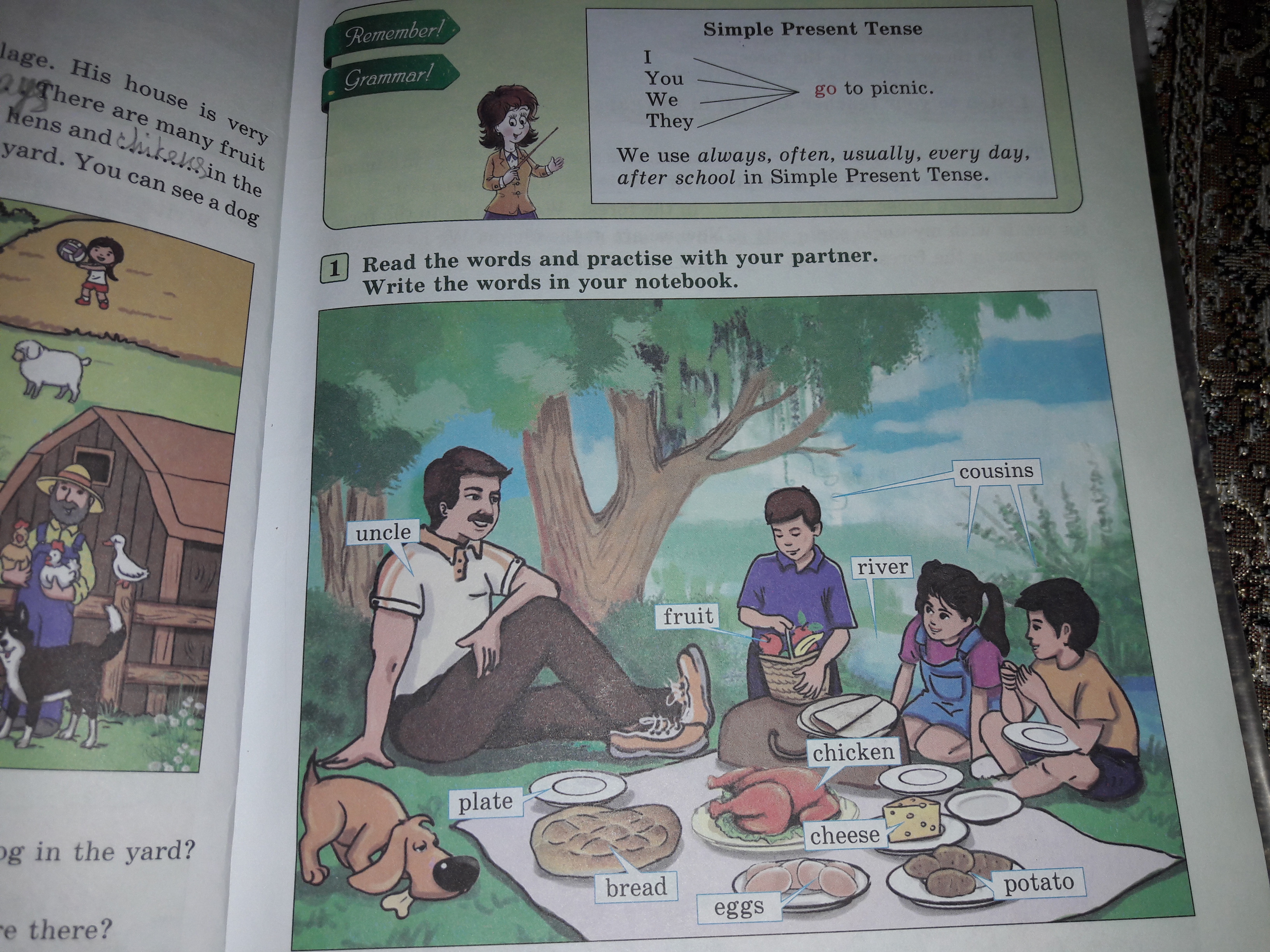 Uncle- дядя, fruit-фрукт, river- река,plate-тарелка, bread- хлеб, eggs-,яйца, chicken - курица, potato- картофель, cheese- сыр.