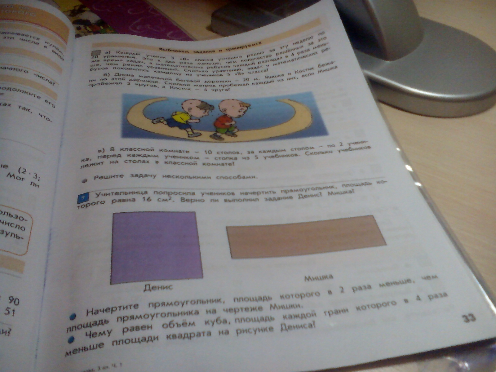 бунеев 3 класс математика страница 33 Учительница попросила учеников начертить прямоугольник площадь которого равна 16 сантиметрам Верно ли выполнили задание Denis Мишка Начертите прямоугольник площадь которого в 2 раза меньше чем площадь прямоугольника на чертеже Мишка мишки Чему равен объем куба площадь каждой грани которого в 4 раза меньше площади квадрата на рисунке Дениса?