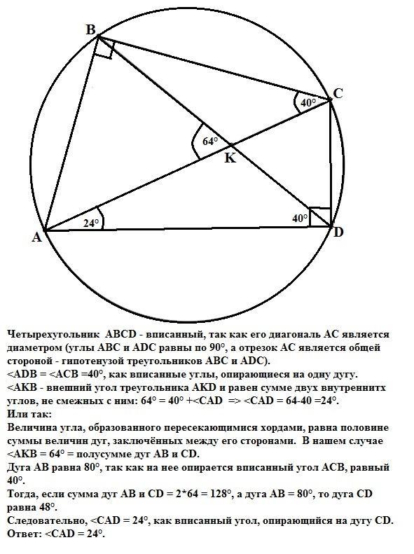 в четырехугольнике ABCD диагонали пересекаются в точке К, угол ABC ровен углу ADC и равен 90 градусов, угол AKB равен 64 градуса, угол ACB равен 40 градусов. найдите угол CAD