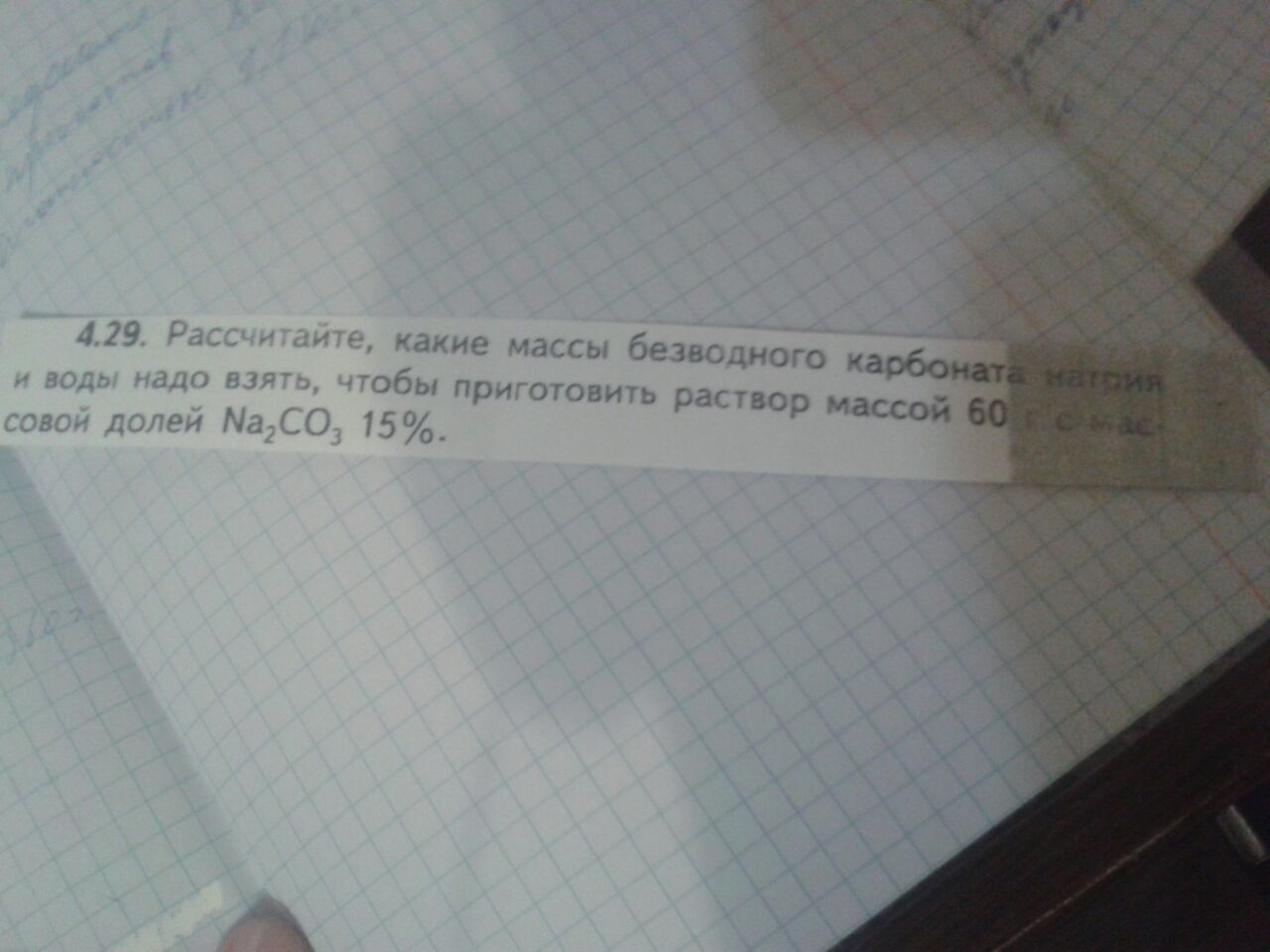 Рассчитайте, какие массы безводного карбоната натрия и воды на взять, чтобы приготовить раствор массой 60 г с массовой долей Na2CO3 15%