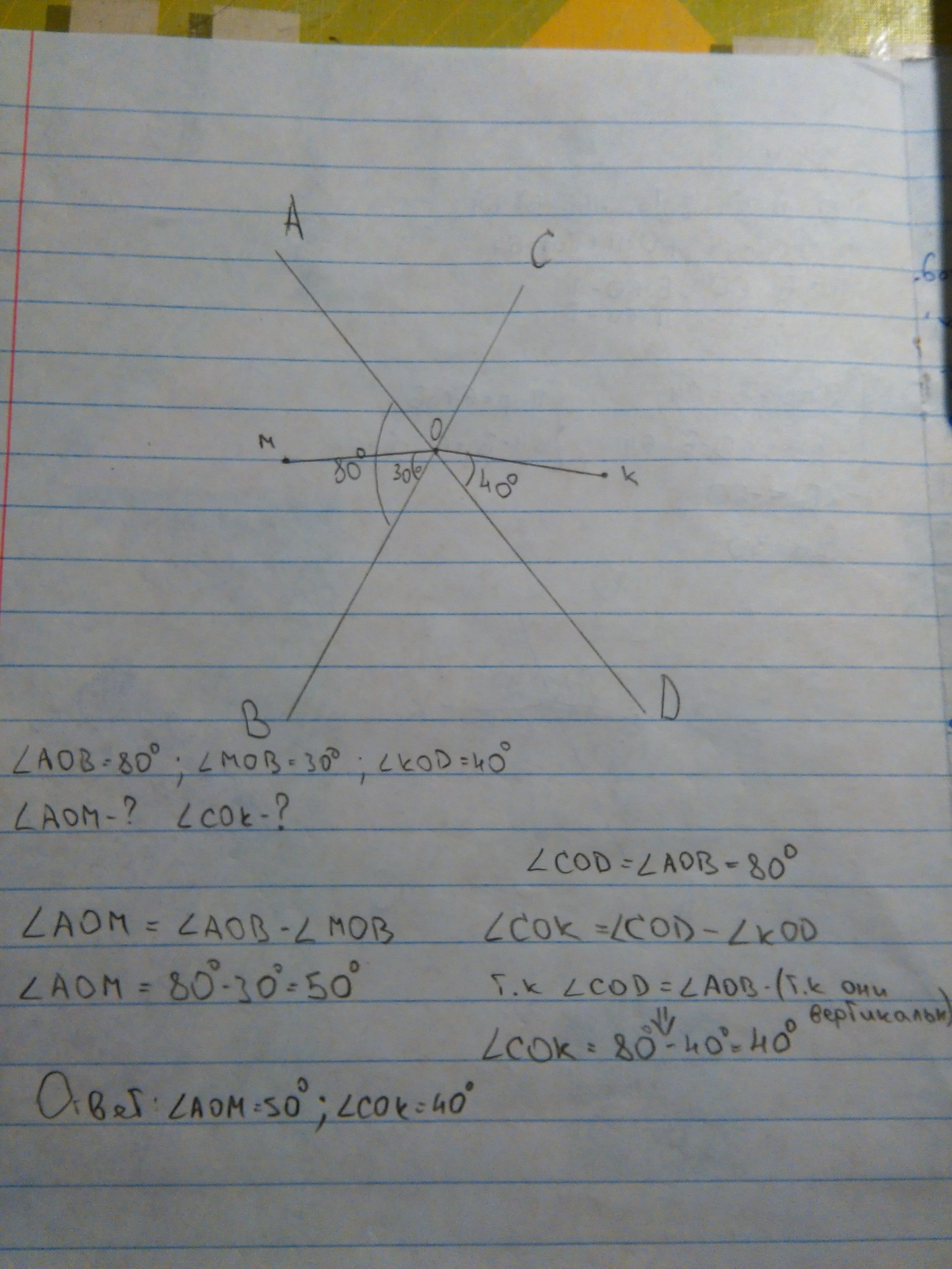 прямые АD и ВС пересекаются в точке О. внутри угла АОВ взята точка М , а внутри угла COD -точка К. АОВ=80 , МОВ=30 .KOD=40 а)Найдите углы АОМ и СОК . б) являются ли углы МОВ и СОК вертикальными ?