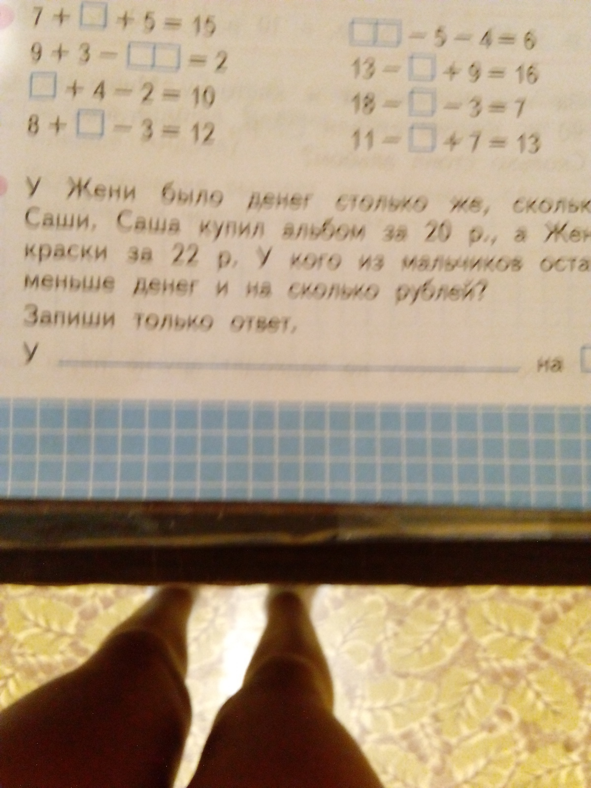 <p>У жени было денег столько же,сколько у Саши. Саша купил альбом за 20р.,а женя краски за 22р,У кого из мальчиков осталось меньше денег и на сколько рублей?</p>а как его можно решить????