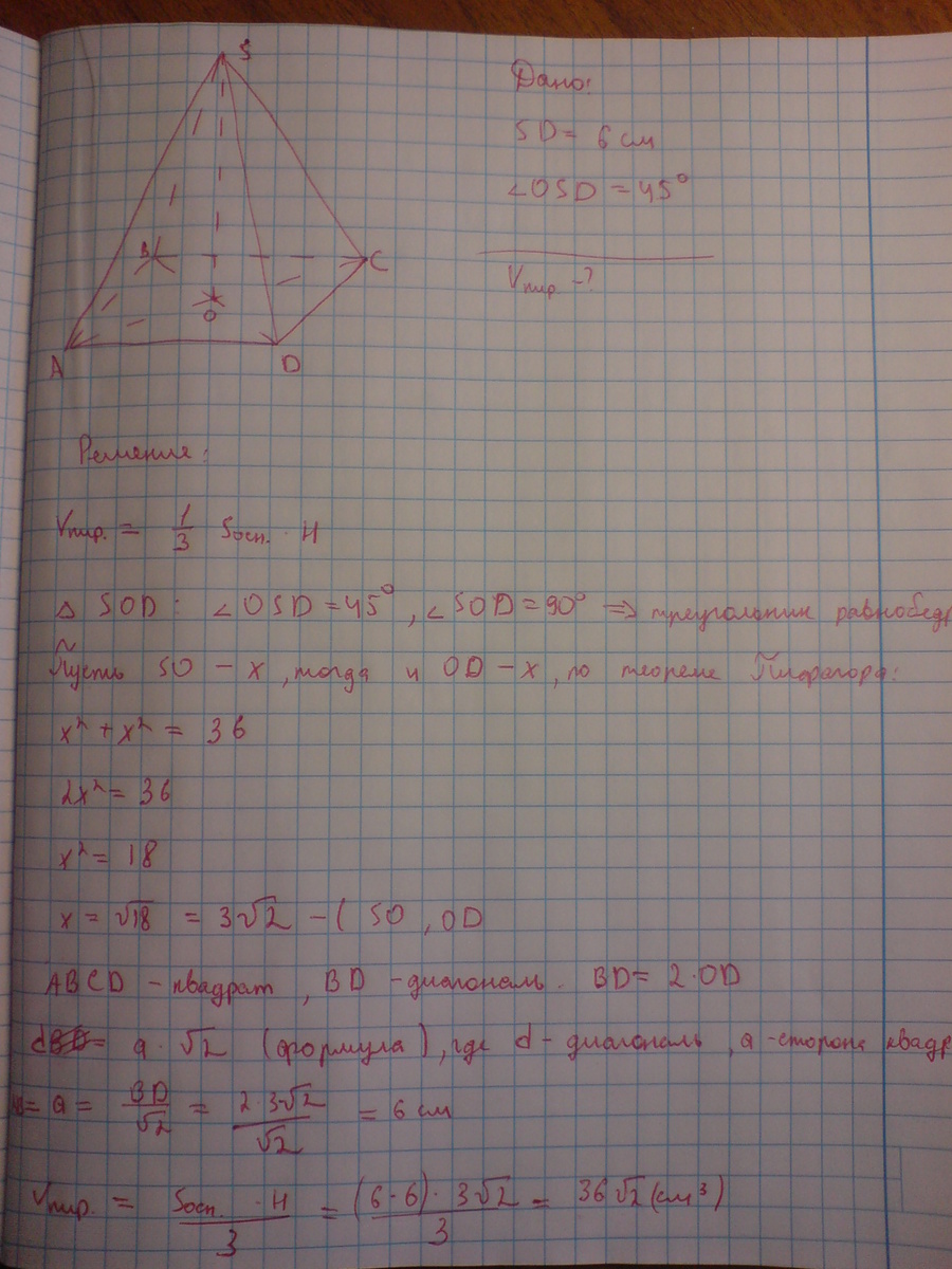 Найдите объём правильной четырёхугольной пирамиды , боковое ребро которой равно 6 см и образует с её высотой угол 45 градусов?