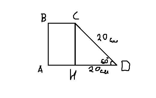 В прямоугольной трапеции острый угол =60 градусов,большая боковая сторона и большее основание =по 20 см.Найти меньшее основание
