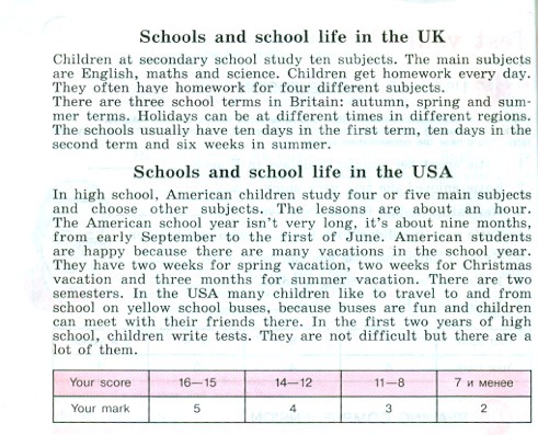 В старшей школе американцы изучают 4 или 5 главных предметов и выбирают дополнительные. Уроки длятся около часа. Школьный год в американских школах не очень длинный, около 9 месяцев. С начала сентября до первого июня. Американские школьники счастливы, потому что у них много каникул в году. У них есть две недели весенних каникул, две недели Рождественских праздников и 3 месяца летних каникул. У них есть два семестра. В США многие дети любят путешествовать в и из школы в желтых школьных автобусах, потому что автобусы веселые (?), и дети могут встретить там своих друзей. Первые два года в старшей школе дети пишут тесты. Они не сложные, но их много.